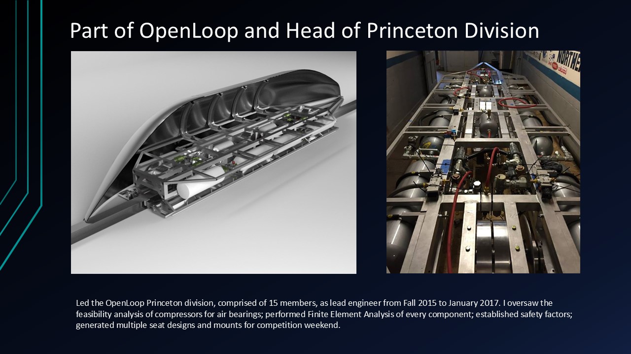 Led the OpenLoop Princeton division, comprised of 15 members, as lead engineer from Fall 2015 to January 2017. I oversaw the feasibility analysis of compressors for air bearings; performed Finite Element Analysis of every component; established safety factors; generated multiple seat designs and mounts for competition weekend.